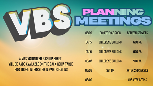 Thank you for your interest in helping with VBS this year! Please make sure to fill out a registration form as well as a background check form (if you have not filled one out previously or it has expired) using the links below. We will be having a few meetings prior to VBS and would like all volunteers to attend, if possible, to help us prepare and make this the best experience for our attendees. The dates of the meetings are listed below. Thank you again, we are so excited to have you as part of the VBS Crew!
